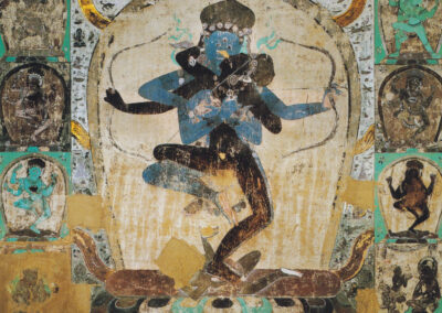 Grotto 465 depicts a powerful duet of Vajrabhairava, a wrathful deity in tantric Tibetan Buddhism, in a dance/erotic embrace with his consort Vajravetali, signifying the inseparable union of compassion and wisdom, essential for awakening.